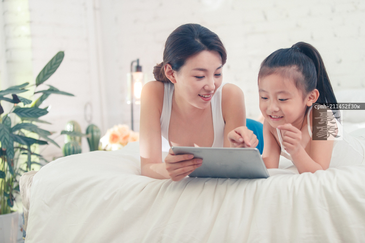 图片标题: 快乐的母女俩玩平板电脑