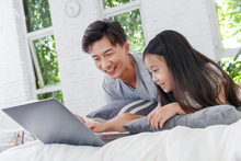 图片标题: 卧室内年轻伴侣在床上睡觉
