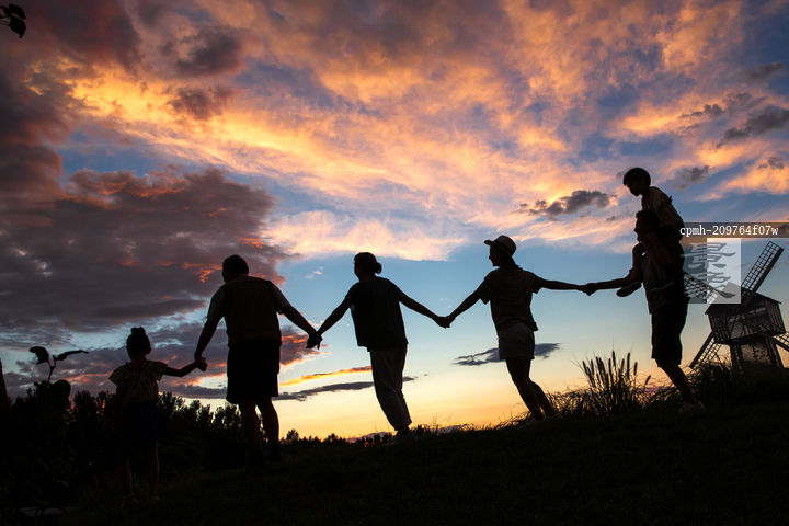 图片标题: 夕阳下手牵手的一家人