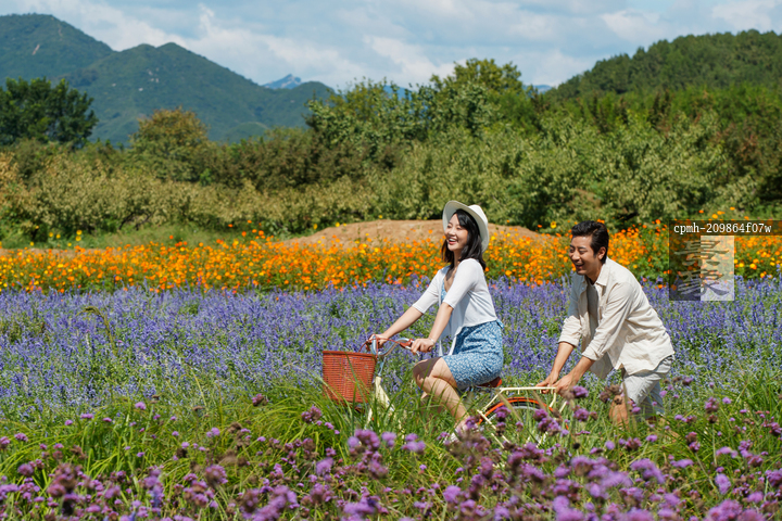 图片标题: 青年夫妇在郊外骑自行车
