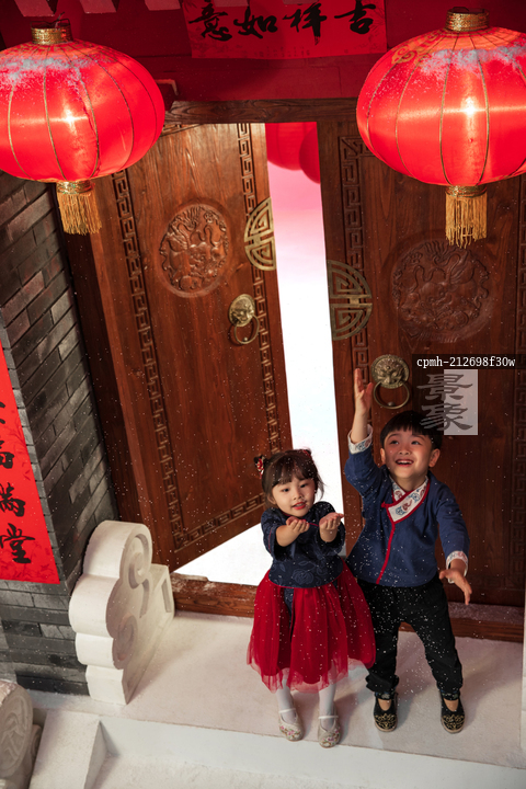 图片标题: 新年在门口玩耍的快乐男孩女孩