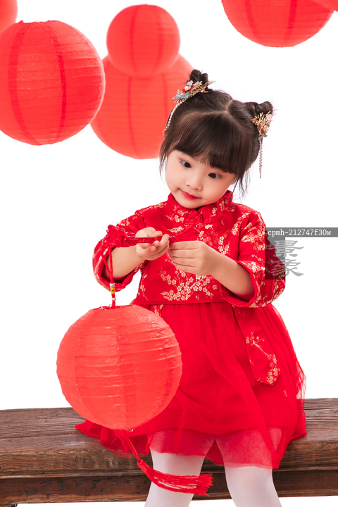 图片标题: 提着灯笼坐在板凳上玩耍的小女孩