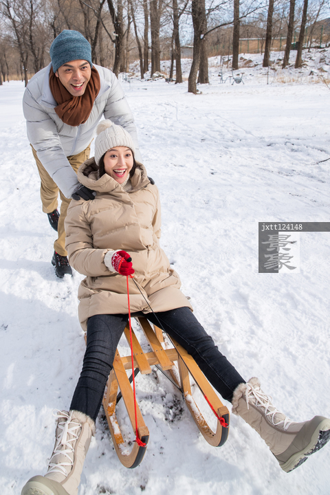 图片标题: 青年夫妇在雪地上玩雪橇