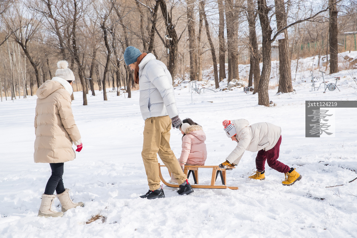 图片标题:     欢乐家庭在雪地上玩雪橇