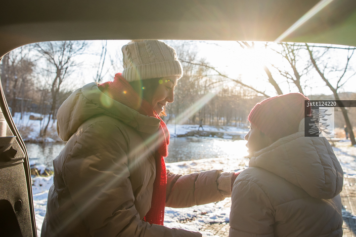 图片标题: 年轻妈妈和孩子坐在汽车旁
