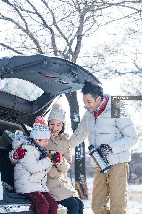 图片标题: 一家三口坐在汽车后备箱上喝水