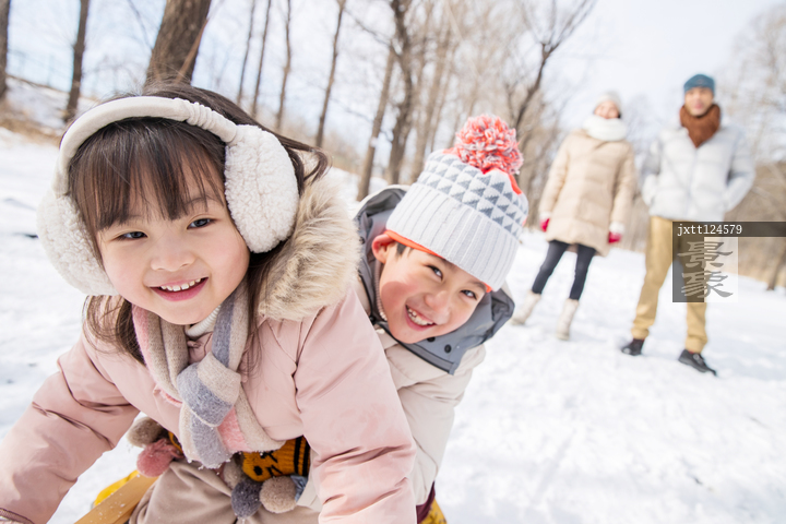 图片标题: 欢乐家庭在雪地上玩雪橇