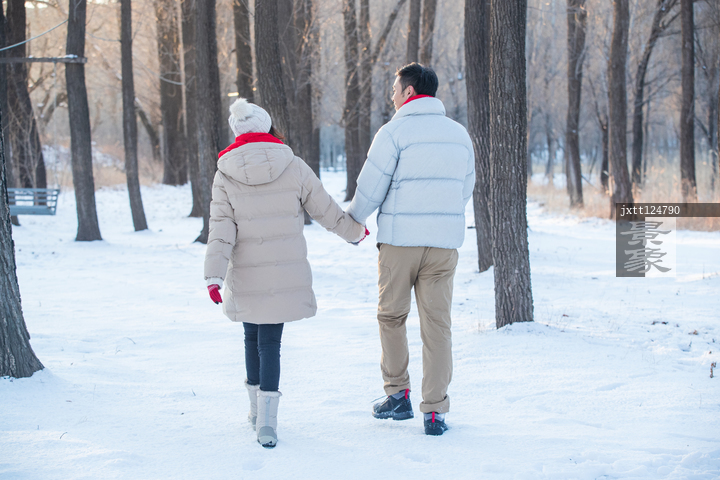 图片标题: 手牵手走在雪地上的夫妇背影