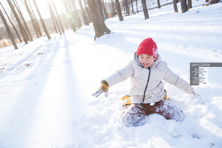 图片标题: 在外面玩雪的小男孩