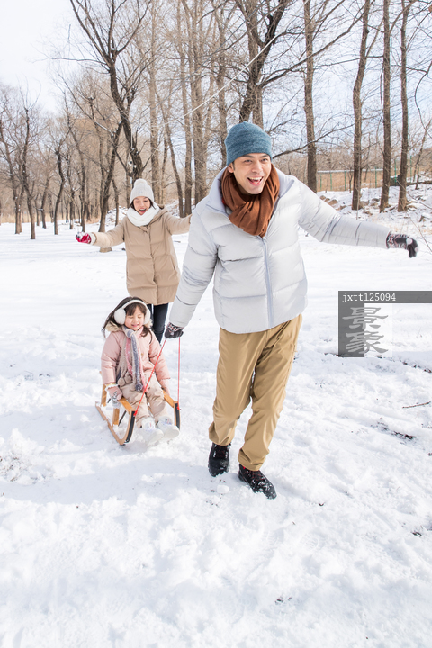图片标题: 拉着雪橇玩耍的一家人