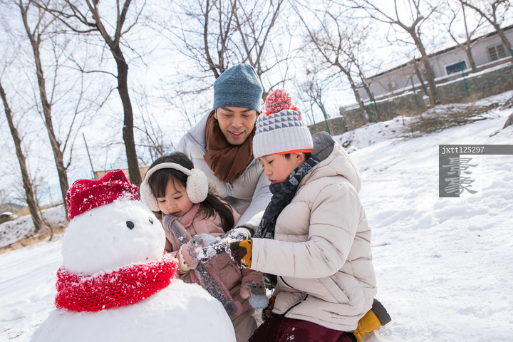 图片标题: 爸爸和孩子们推雪人