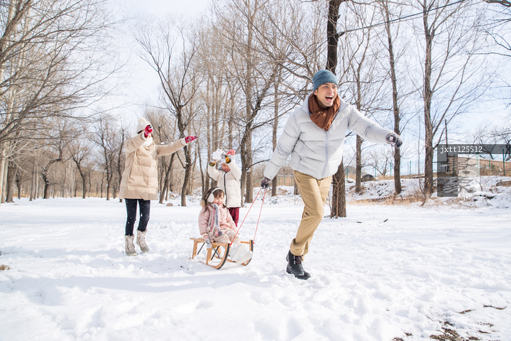 图片标题: 欢乐家庭在雪地上玩雪橇