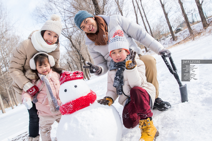 图片标题: 欢乐的一家四口在雪地里堆雪人