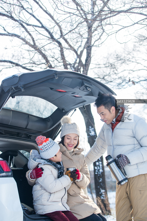 图片标题: 一家三口坐在汽车后备箱上喝水
