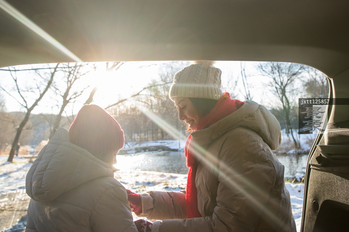图片标题: 年轻妈妈和孩子坐在汽车旁