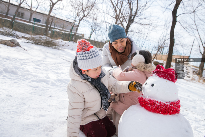 图片标题: 爸爸和孩子们推雪人