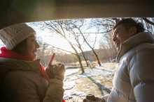 图片标题: 欢乐家庭在雪地上玩雪橇