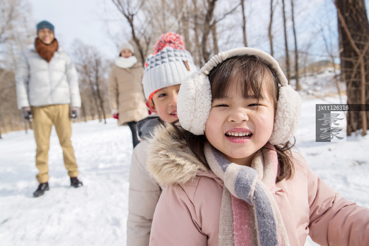 图片标题: 欢乐家庭在雪地上玩雪橇
