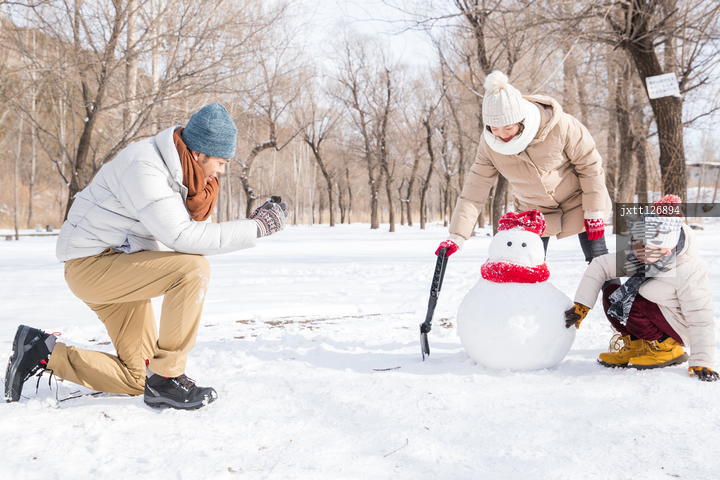 图片标题: 欢乐家庭在雪地里照相