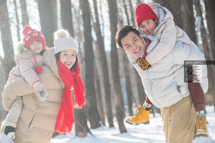 图片标题: 雪地里玩耍的快乐家庭