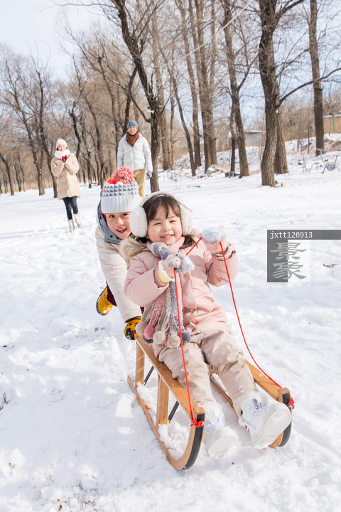 图片标题:     欢乐家庭在雪地上玩雪橇