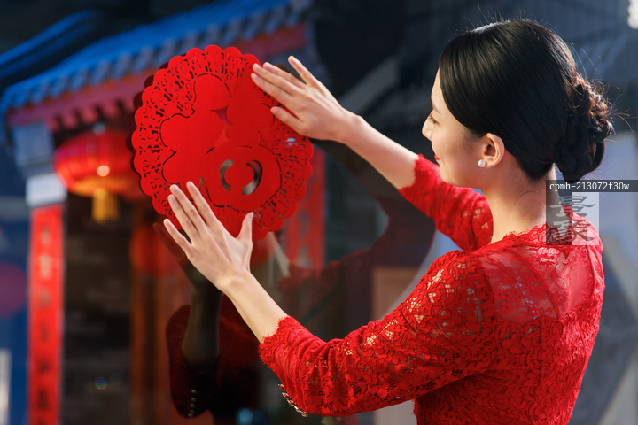 图片标题: 年轻女人过年贴窗花