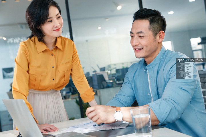 图片标题: 商务男女在办公室讨论工作