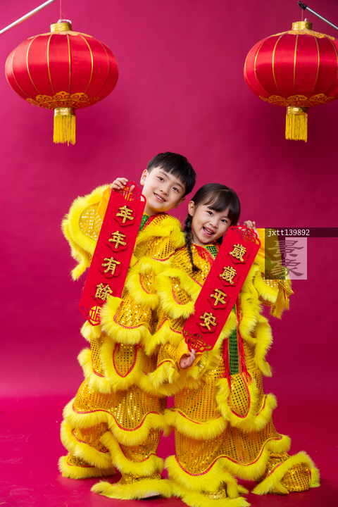 图片标题: 舞狮子的男孩女孩庆祝新年