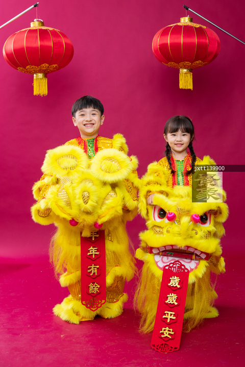 图片标题: 舞狮子的男孩女孩庆祝新年