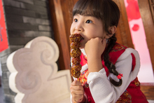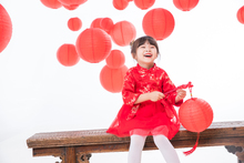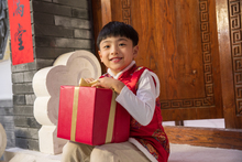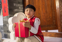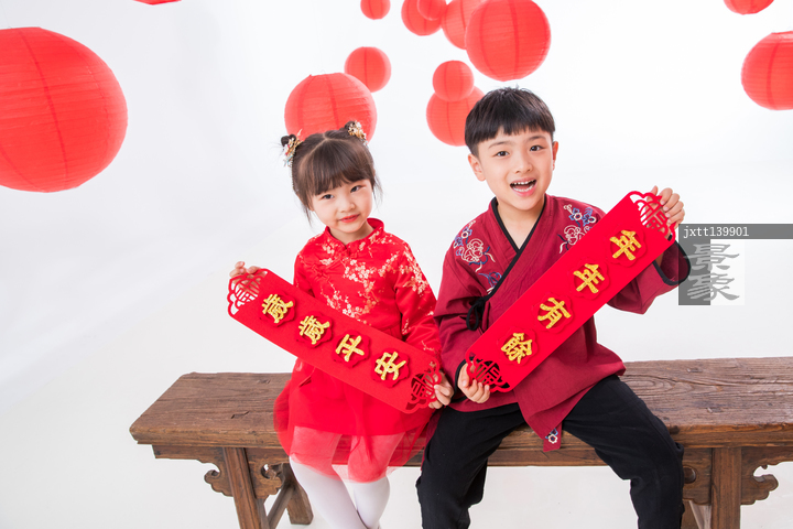 图片标题: 欢乐的男孩女孩拿着春联庆祝新春