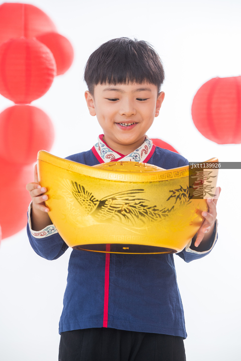 图片标题:     快乐的小男孩抱着金元宝
