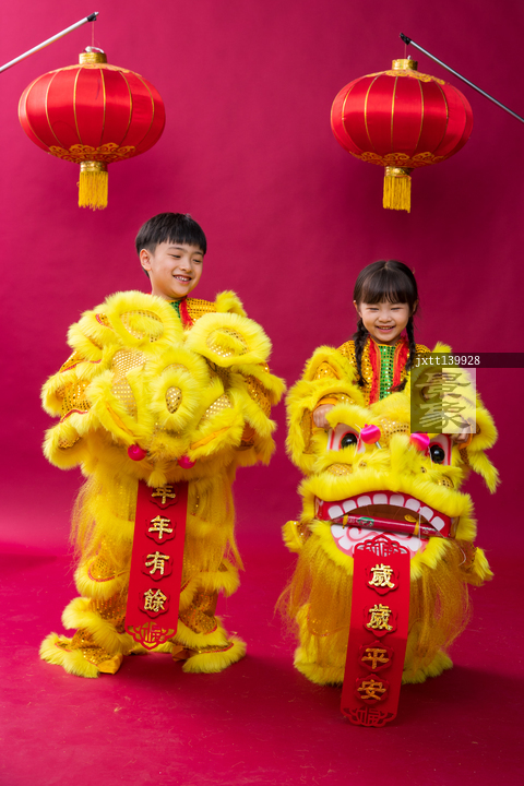 图片标题: 舞狮子的男孩女孩庆祝新年