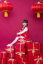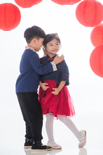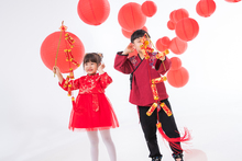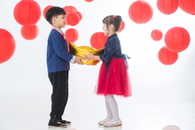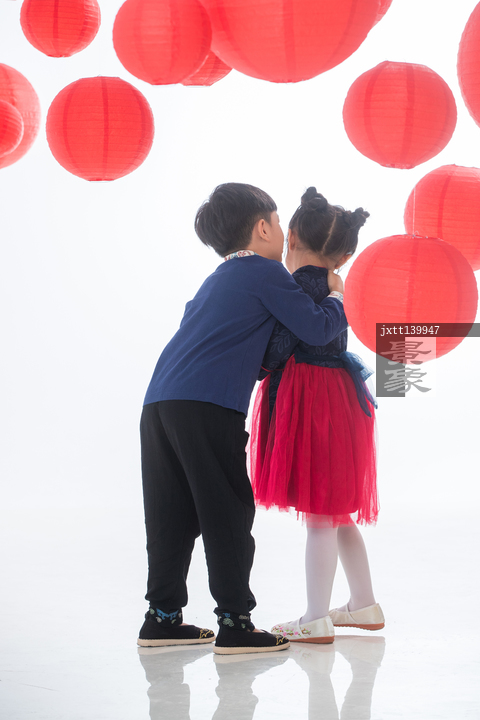 图片标题: 红灯笼下玩耍的快乐男孩和女孩