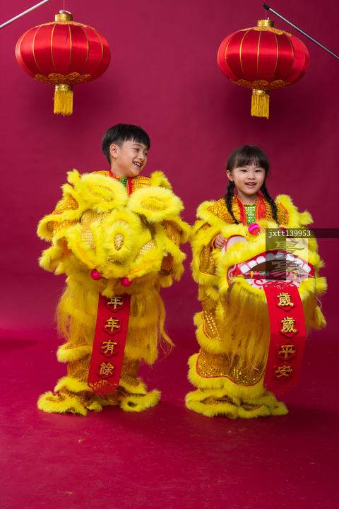 图片标题: 舞狮子的男孩女孩庆祝新年