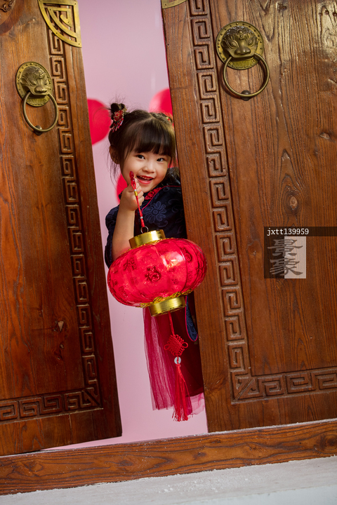 图片标题: 可爱的小女孩拿着红灯笼站在大门口