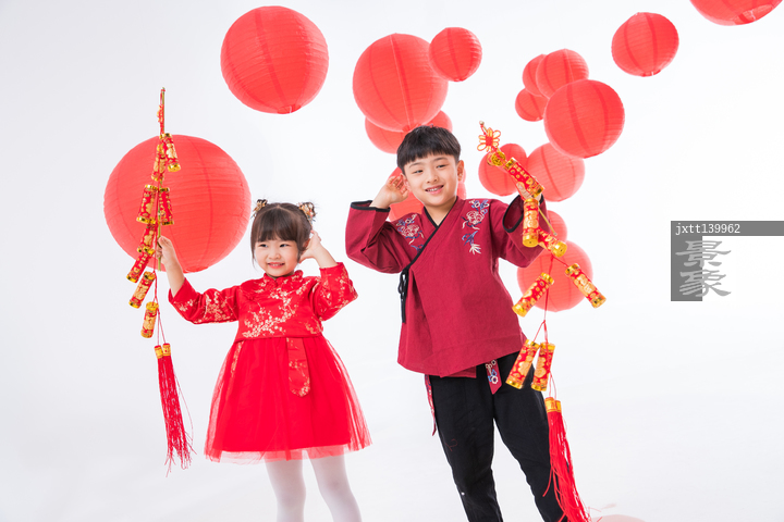 图片标题: 快乐的男孩女孩放鞭炮