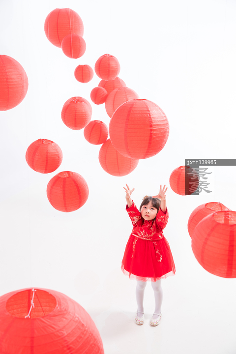 图片标题: 快乐的小女孩在红灯笼下玩耍