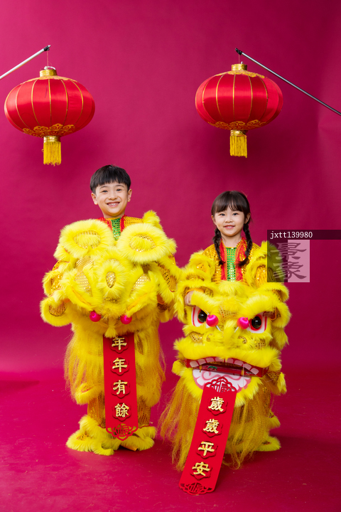 图片标题:     舞狮子的男孩女孩庆祝新年