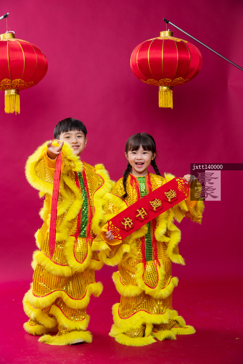图片标题:     舞狮子的男孩女孩庆祝新年