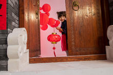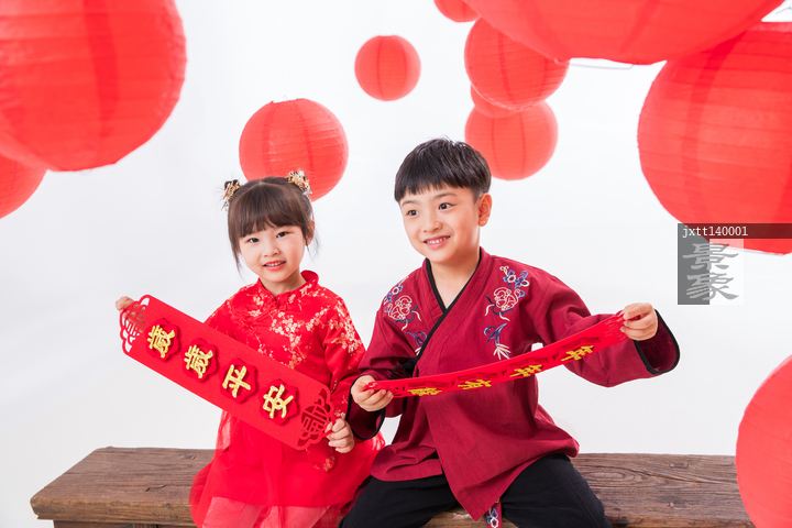 图片标题: 欢乐的男孩女孩拿着春联庆祝新春