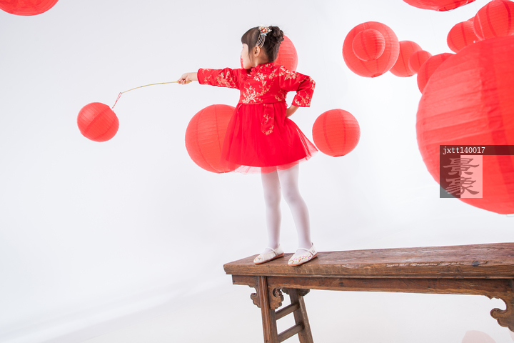 图片标题: 快乐的小女孩拿着红灯笼玩耍