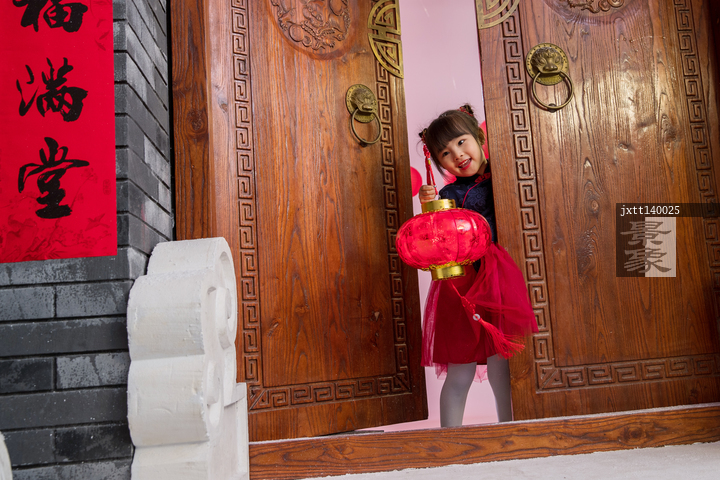 图片标题: 可爱的小女孩拿着红灯笼站在大门口