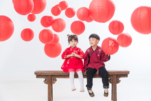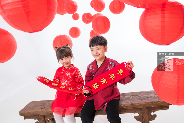 图片标题: 欢乐的男孩女孩拿着春联庆祝新春