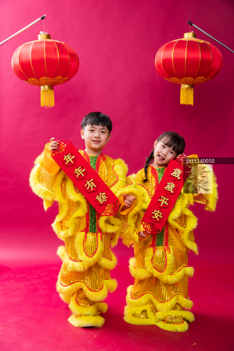 图片标题: 舞狮子的男孩女孩庆祝新年