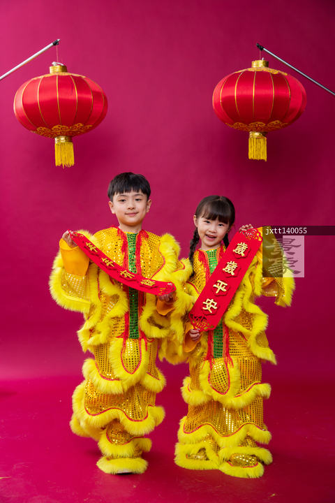 图片标题: 舞狮子的男孩女孩庆祝新年