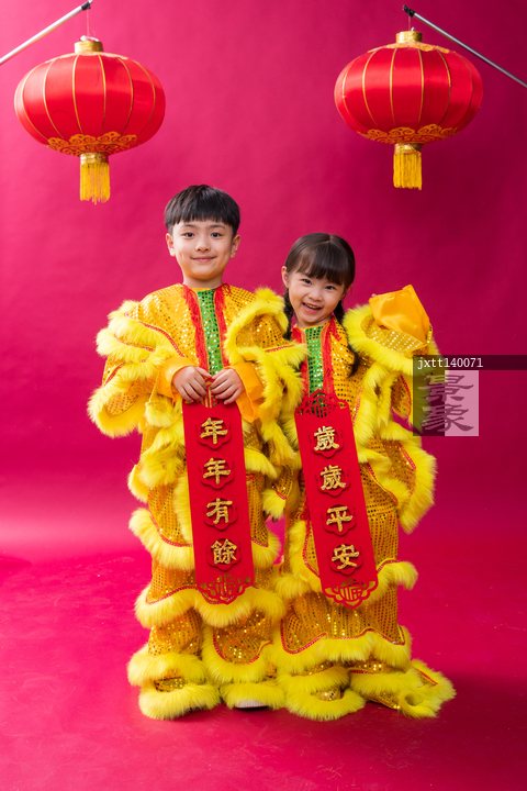 图片标题: 舞狮子的男孩女孩庆祝新年