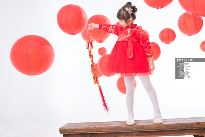 图片标题: 快乐的小女孩拿着红灯笼玩耍