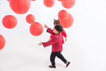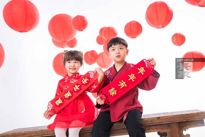 图片标题: 欢乐的男孩女孩拿着春联庆祝新春