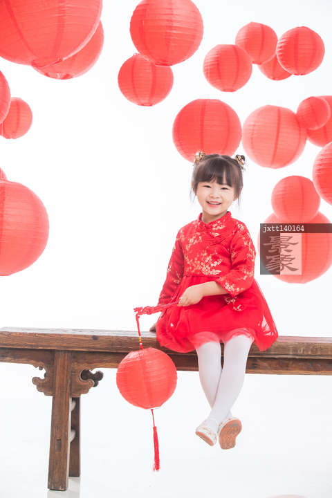 图片标题: 快乐的小女孩拿着红灯笼玩耍