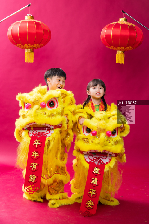 图片标题:     舞狮子的男孩女孩庆祝新年